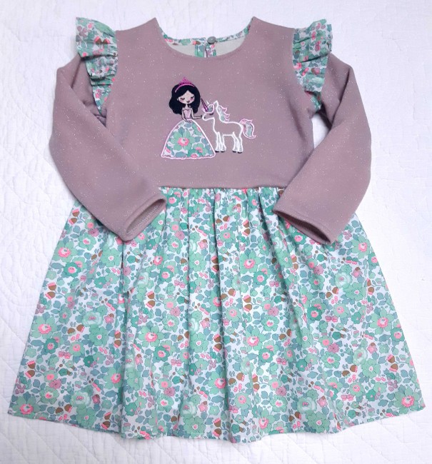 Robe taille basse sweat molleton indigo pailleté et appliqué broderie Liberty reine des neiges.
