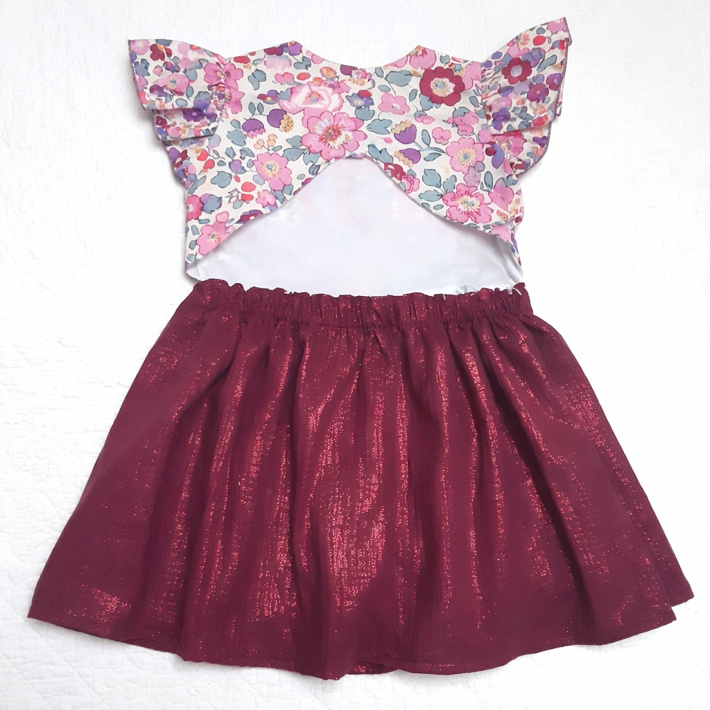 Robe Amélie bi matière Liberty Betsy pétale irisé jupe double gaze framboise scintillante – charme rétro et légèreté estivale